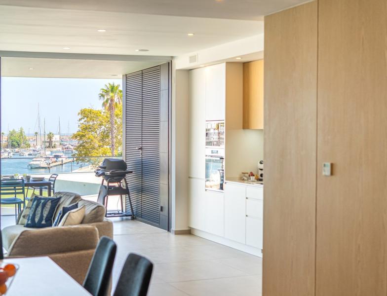 This 2nd floor residence features not only stunning frontal views of the Marina and out to the ocean from its expansive front terrace, but also a large rear terrace perfect for watching storks and other wildlife on the estuary. The 2nd Floor location (3rd floor above ground since there is also a zero or ground floor) near the river provides a close connection to the marina and estuary, and the pool building magically blocks the view of the street and traffic circle outside the building. The building offers exclusive amenities including a shimmering outdoor pool, sun deck, heated indoor pool, hot tub, sauna, fully-equipped gym, and two dedicated underground parking stalls.