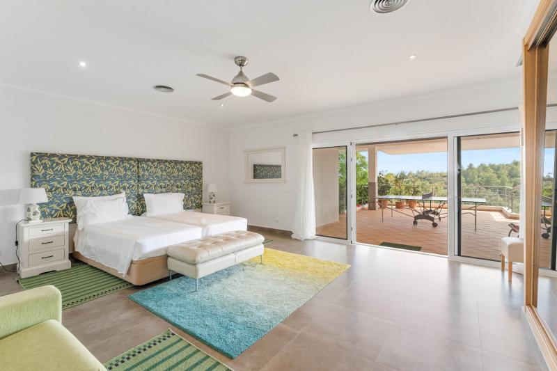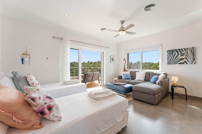 The main floor also features a chic twin bedroom with direct terrace access, a sofa bed for one guest, an en-suite bathroom, and a convenient guest WC.