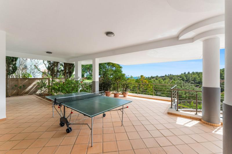 On the lower level, a fourth en-suite bedroom opens onto a shaded terrace, complete with ping-pong for laid-back holiday fun. This bedroom hosts twin beds and a sofa bed for an extra guest. Just steps away lies the heated saltwater pool, beautifully integrated into the private, landscaped garden. An outdoor shower and WC offer extra convenience for poolside living. The pool can be heated between May and September for 200€/week.